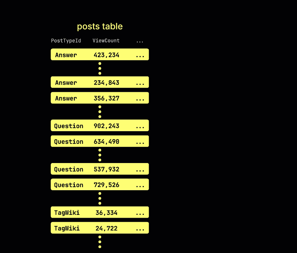 Consider the following optimized table. This contains Stack Overflow data with a row per post.